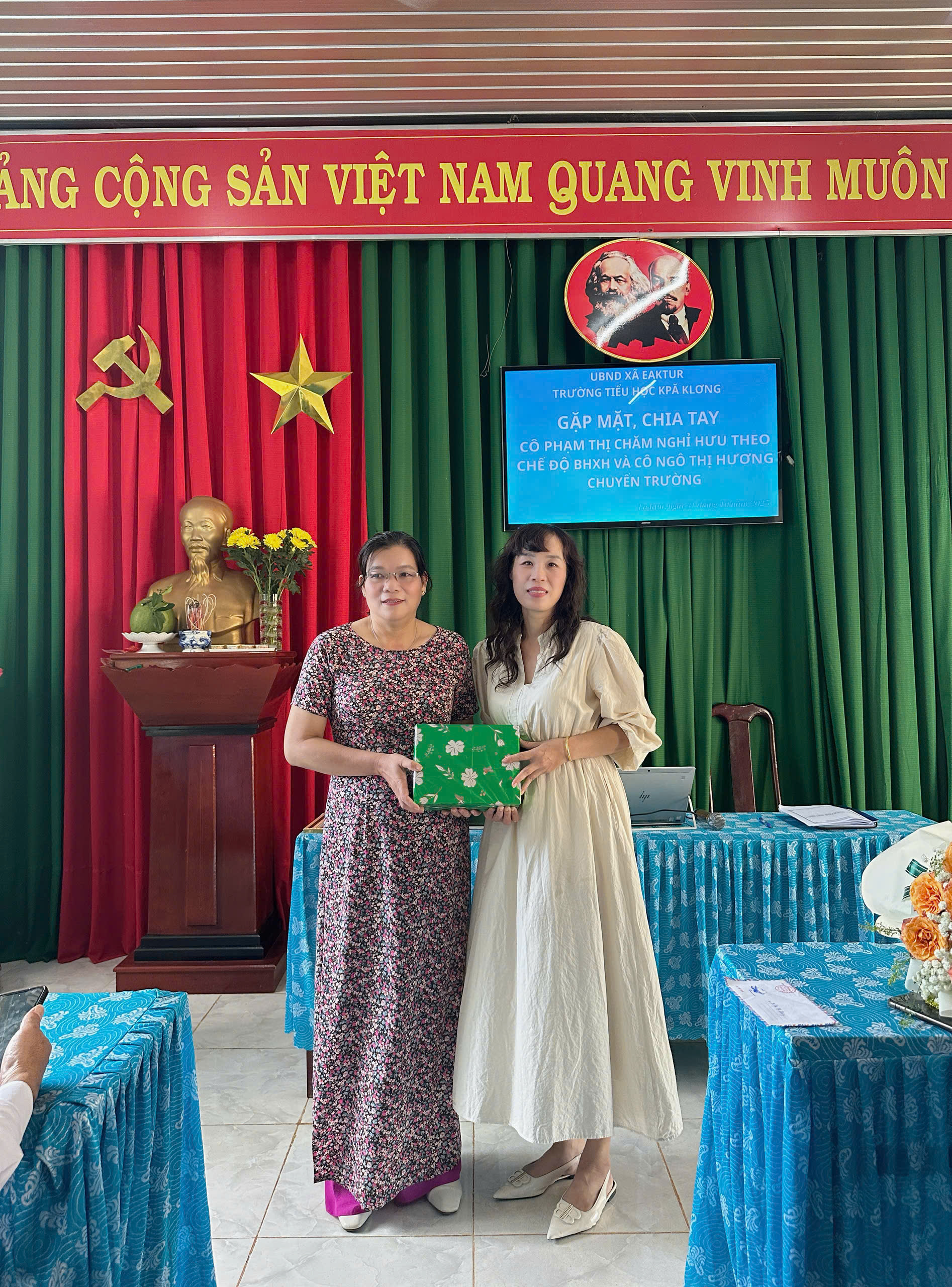 Những bó hoa tươi thắm, những lời chúc chân thành cùng những ánh mắt xúc động đã thể hiện tình cảm trân quý mà tập thể sư phạm Kpă Klơng dành cho hai cô. Cô Phạm Thị Chăm – người giáo viên mẫu mực, tận tâm, đã dành cả thanh xuân gắn bó với học trò vùng cao, để lại biết bao kỷ niệm đẹp. Cô Ngô Thị Hương – một đồng nghiệp trẻ nhiệt huyết, sáng tạo, luôn mang đến năng lượng tích cực trong công tác và cuộc sống.